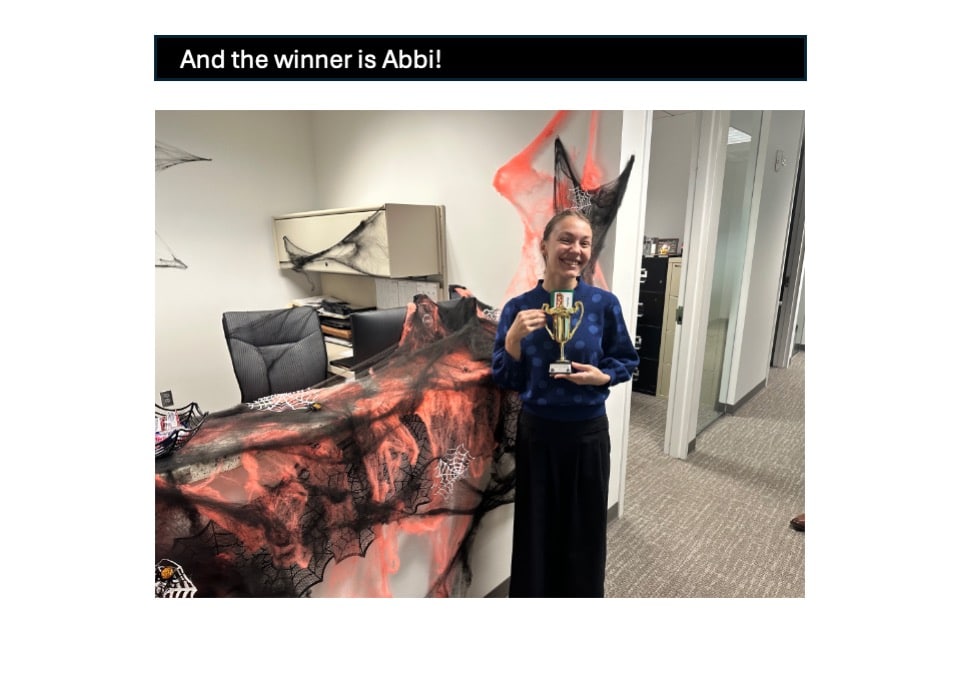 Team members got the chance to tour the office (or scroll through photos remotely) and cast their votes for the best-decorated space. This year’s winner was Abbigale (Abbi) Higdon!